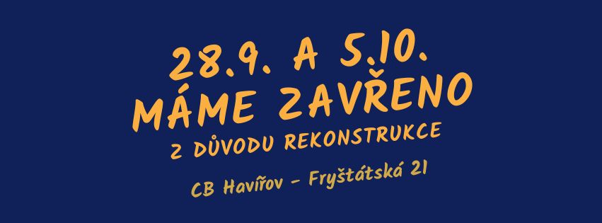 Z důvodu rekonstrukce budovy CB v Havířově není možné pořádat bohoslužby ani další akce. 28.9. ani 5.10. tedy nebudou ani pravidelné nedělní bohoslužby. Využijte příležitosti a navštivte okolní sbory a církve, nebo si udělejte domácí bohoslužbu. 5.10. bude naše bohoslužba v Orlové od 10 hod, budova CB v Orlové sídlí v Lutyňské ulici 4/350.
